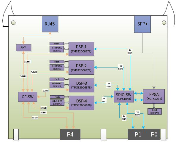 l 4片DSP和1片FPGA通过SRIO交换芯片实现互联,到背板支持2路4x SRIO port,支持RapidIO2.0协议