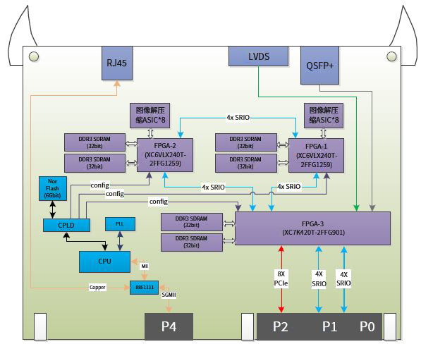 l 3片PPGA组成,K7 FPGA实现数据通信和管理,V6 FPGA实现图像解压缩处理