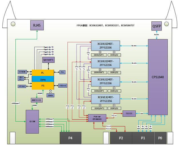 l 4片V6 FPGA之间通过SRIO和PCIE交换芯片互联,同时任意两片V6 FPGA实现GTX互联